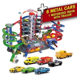 - 1 garage parking playset with seven floors, 2 motorised lifts, 6 die-cast cars, 1 battery-powered train with trailer, train station, car repair workshop, police station and helicopter landing pad