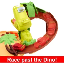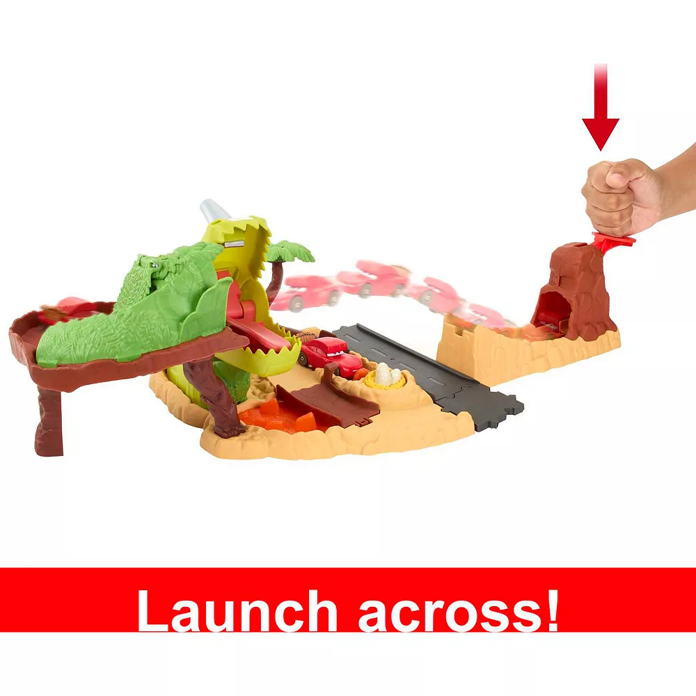 - Kids use the launcher to jump vehicles over the lava field and onto the track, but only if they can make it past the dino’s chomping jaws!