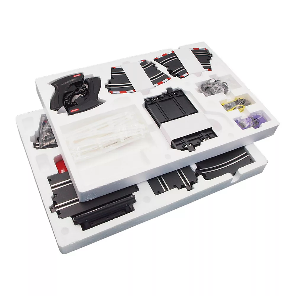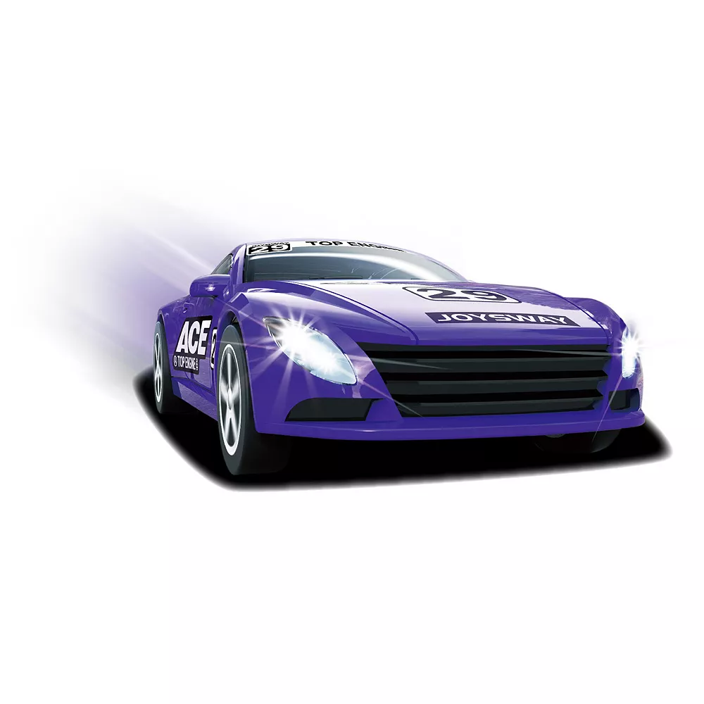 - KING yellow sport car x 1, ACE purple sport car x 1, Digital proportional speed controller x 2, Digital Display Lap counter & Powerbase combo track x 1, USB power cable x 1, Curve track x 14, Straight track x 16, Banked Track x 4, Crossover Track x 2, Bridge Stand x 6, Bridge Pillar x 8, Holding Post Connector x 2, Holding Post for Banked Tracks x 2, Bridge barrier x 4, Bridge Track Support x 6, Guardrail x 14, Manual x 1, Label sticker for lap. counter and bridge barrier.