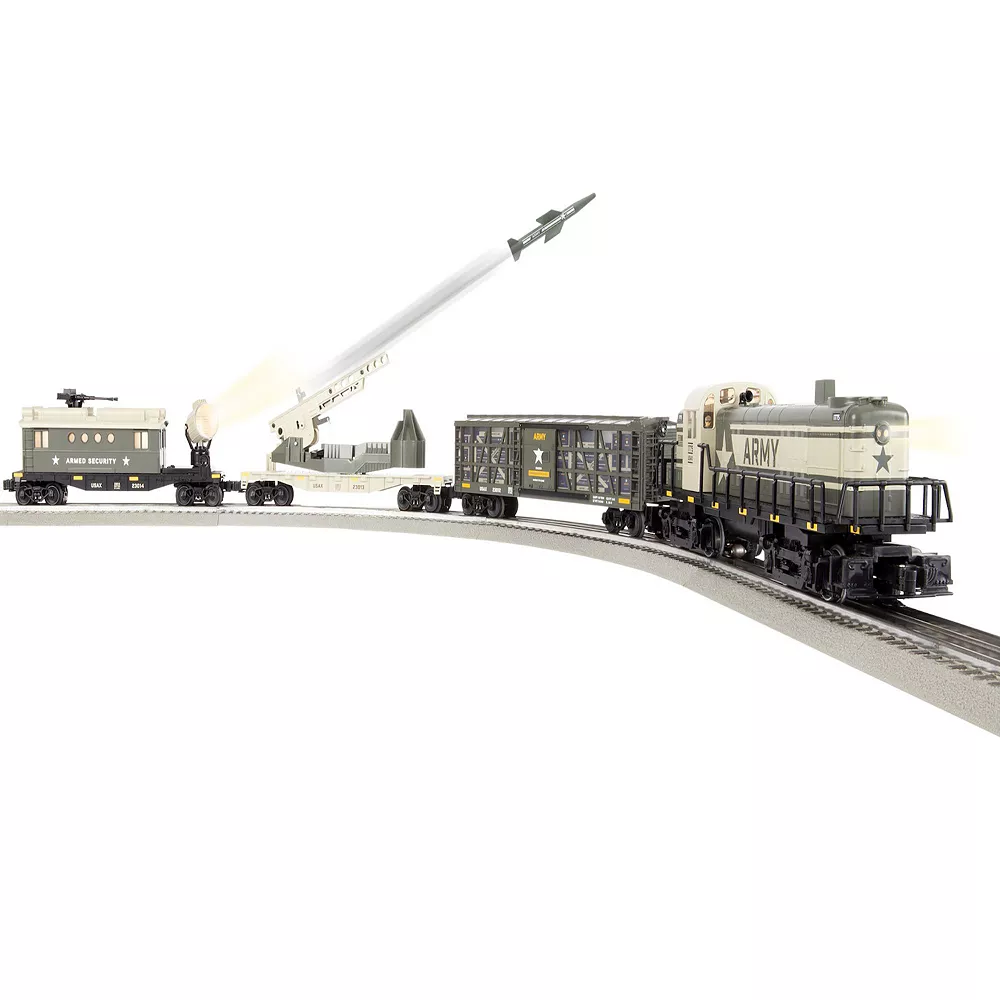 - RS-3 Diesel Locomotive, Ammunition Stock Car, Missile Launching Car, Security Caboose, Eight Curved O36 FasTrack sections, Two 10 Inch Straight FasTrack sections, One LionChief FasTrack Terminal section, One Plug Expand Play Power Lock-on section, Wall-pack Power supply, LionChief Remote for Locomotive