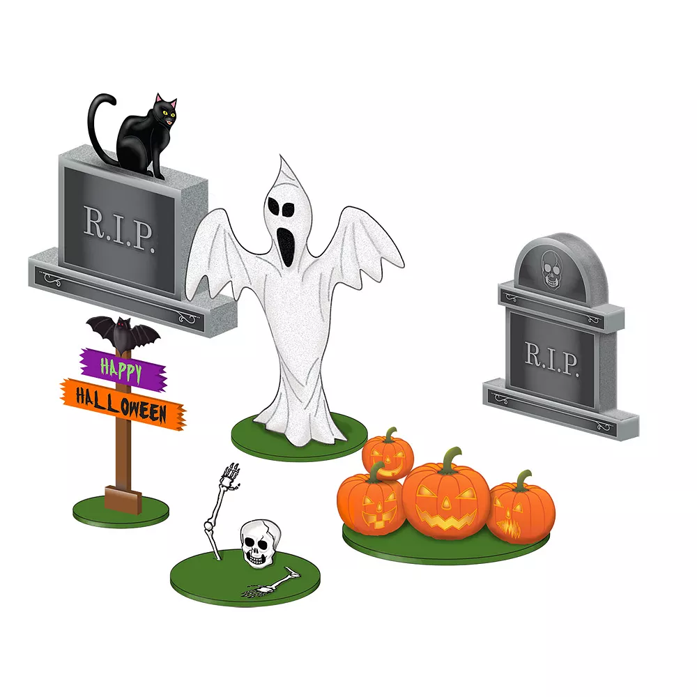 Make your layout Spooktackular with this Halloween Lawn Figure Pack from Lionel. Each plastic figure is hand painted and the pack includes: (1) Pumpkins Figure; (1) Ghost Figure; (1) Bat Sign Figure; (1) Skeleton Figure; (1) R.I.P. Grave Stone with a black cat and (1) R.I.P Grave Stone.