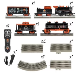 - Hallows Eve Limited Steam Locomotive Tender, Hallows Eve Illuminated Boxcar, Hallows Eve Triple-dome Tank Car, Hallows Eve Caboose, Eight O36 Curved FasTrack sections, Two 10″ Straight FasTrack sections, One Terminal FasTrack section, One Plug-Expand-Play Power Lock-on section, Wall-pack Power Supply, Lion Chief Remote for Locomotive, Owner Manual