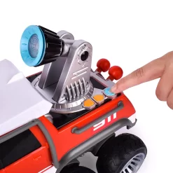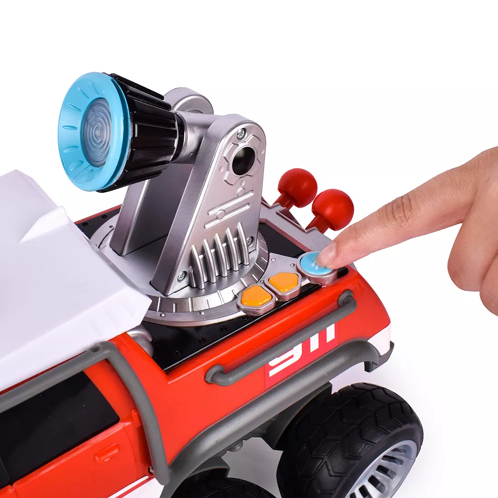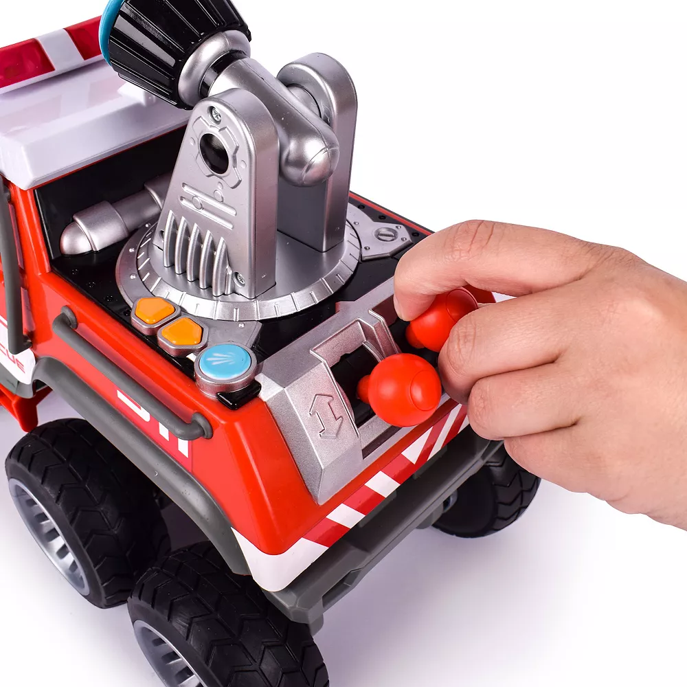- WATER JET: Fill the cap in the truck bed or roof, use the levers to spin and move the motorized cannon, then push the blue button to spray! The jet blasts water over 12 feet!