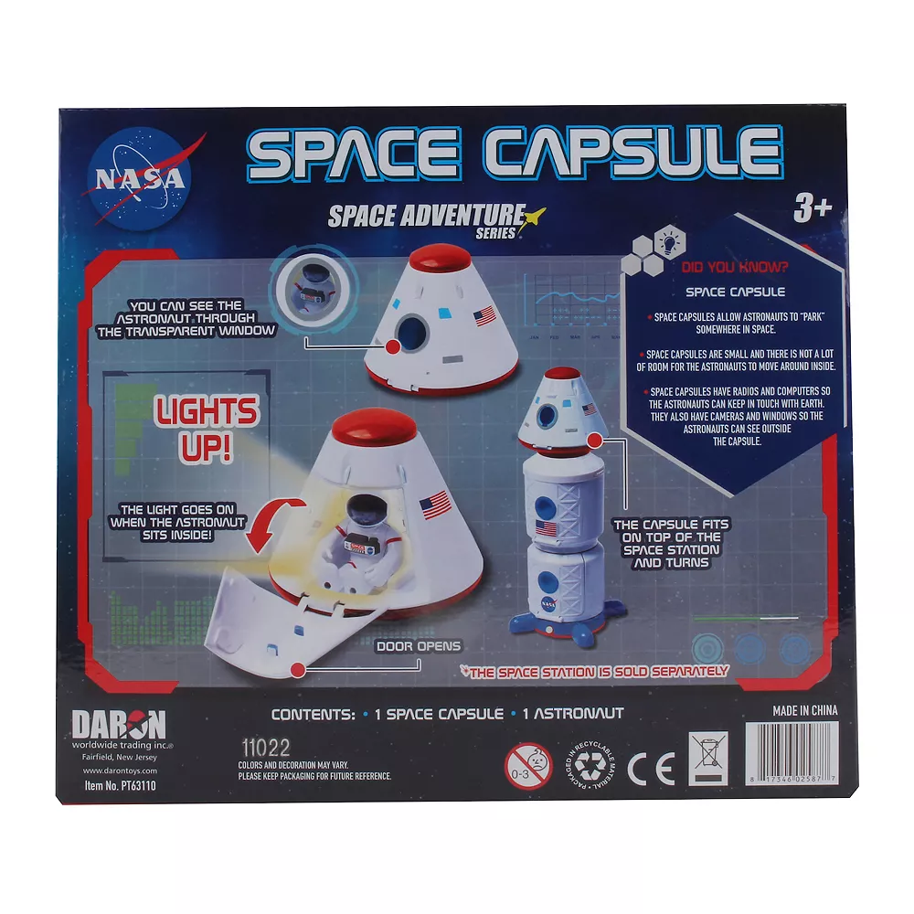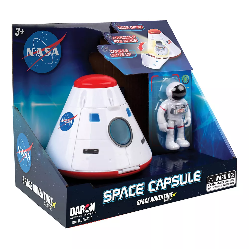 This plastic NASA brand space capsule is a part of the Space Adventure Series and features a fully functional design with interior lights and a door that opens to allow the figurine to be placed inside.