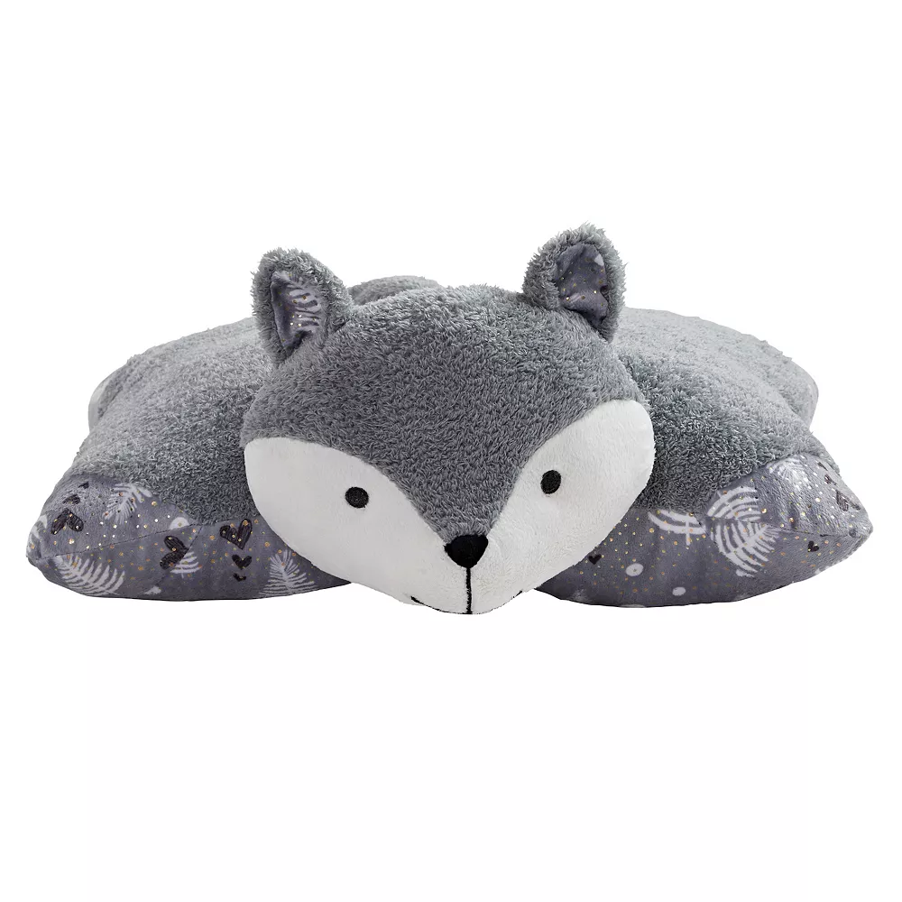 Bring your favorite animal home in the form of a pillow pet! This naturally comfy fox features a gray and white fox with a patterned underside with trees, hearts, and gold dots.