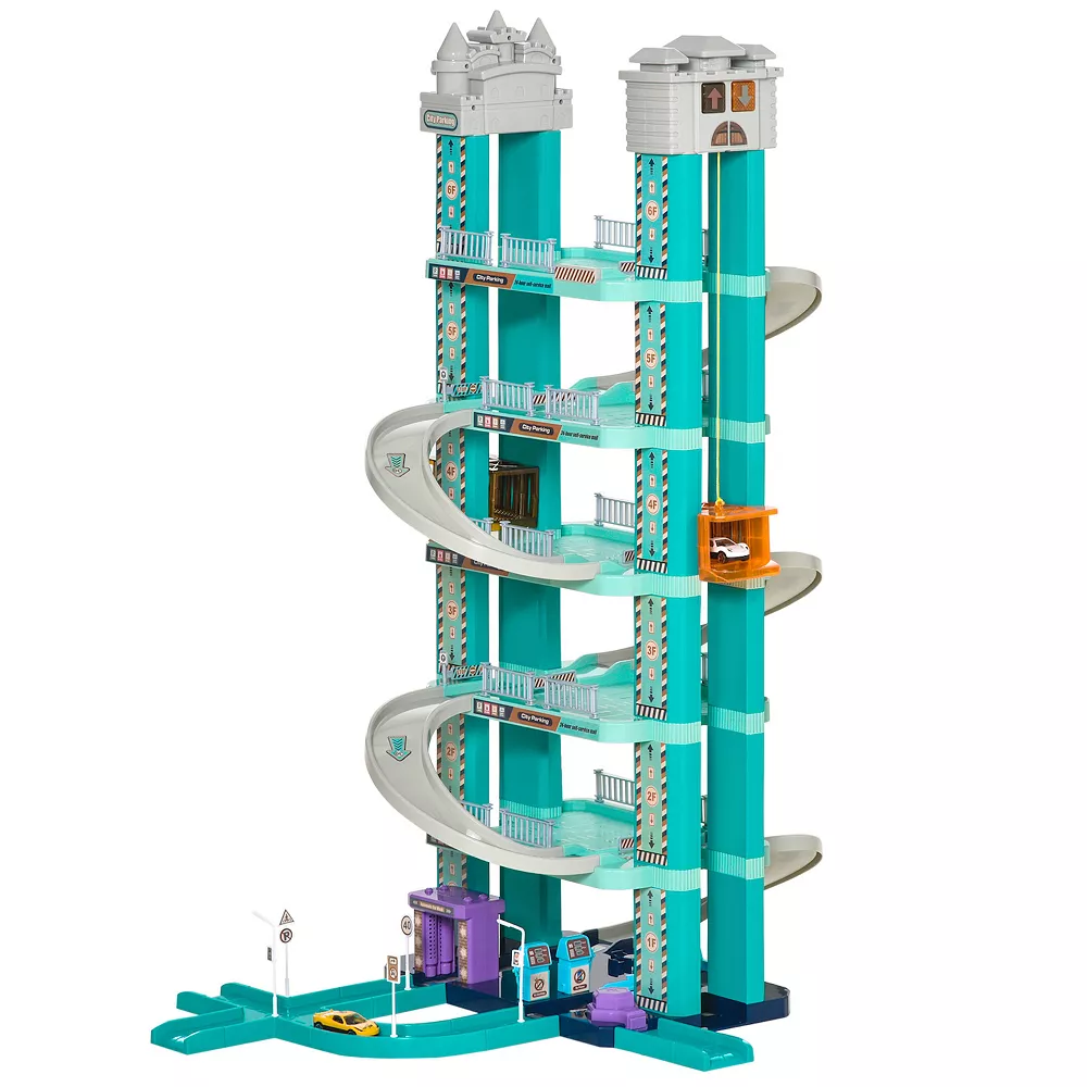 - 6-LEVEL PARKING GARAGE: This vehicle playset provides endless entertainment. Garage set contains a 6-level parking lot with fast spiral ramps, wash station, repair station (liftable), rest area, refueling station, ejector station, traffic signs, 2 alloy cars, and more.