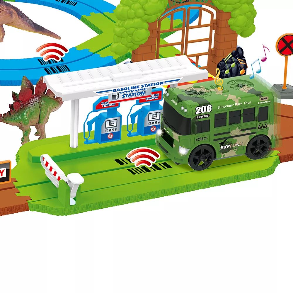 - Using Intelli-Bus Technology, the Intelli-Bus as it travels will encounter barcodes on the tracks at which point will play an informational audio clip of the different dinosaurs at different locations